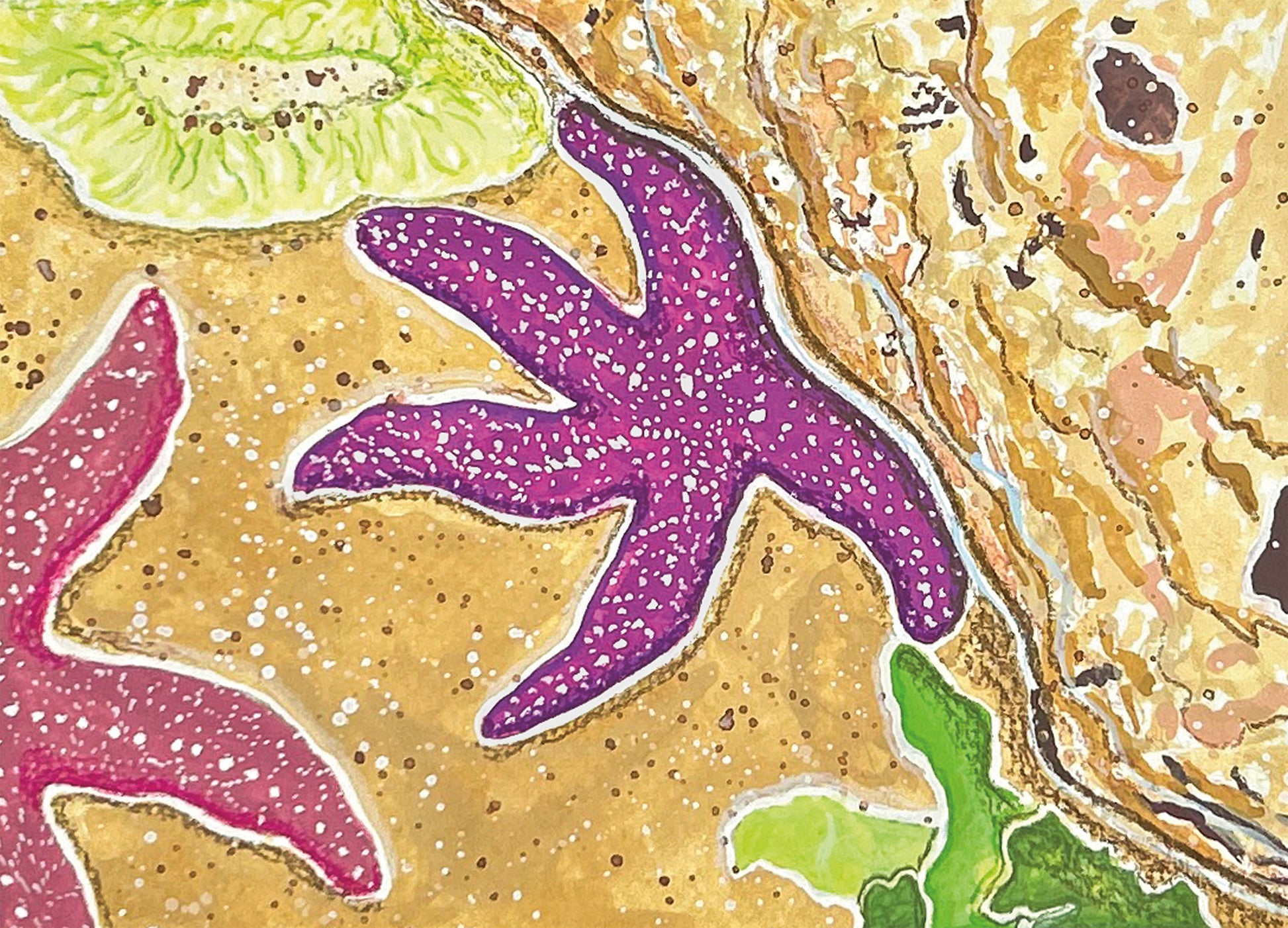 Painted after a beach walk on the Oregon coast. The kind of moment where the awe of the unexpected catches you—you expect a good old East Coast orange sea star and get shades of purple instead. Also featuring a lemony-yellow urchin and a little sand you’ll find for days.